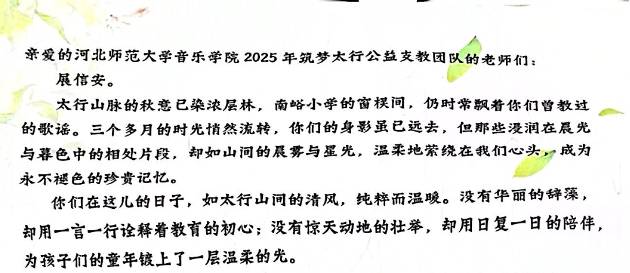 近日,一封来自太行山脉深处的特殊来信寄到FB体育 。石家庄赞皇县院头镇南峪小学的师生们以笔墨传情,字里行间满是对2025年暑期“筑梦太行”公益支教团队的思念与感恩。这封跨越山海、跨越时间的书信,不仅细数了南峪小学日新月异的变化,更让那段浸润着爱与温暖的支教时光,成为连接FB体育 与赞皇县院头镇南峪小学师生情谊的精神纽带。
